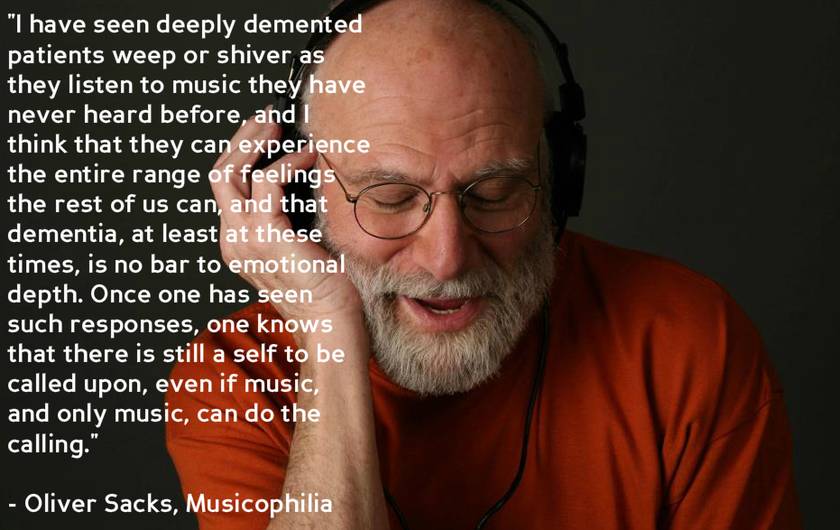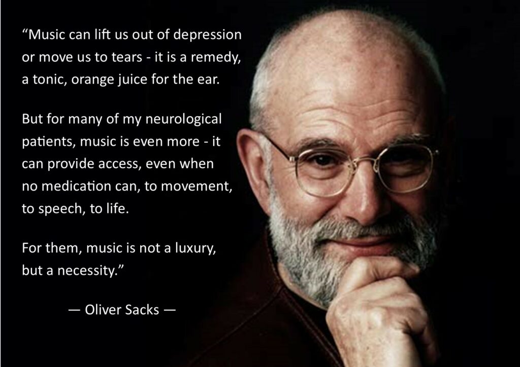 In zijn invloedrijke boek Musicophilia beschrijft Sacks hoe muziek unieke toegang biedt tot het brein. Zelfs wanneer taal, geheugen en oriëntatie ernstig zijn aangetast, blijft muziek vaak intact.